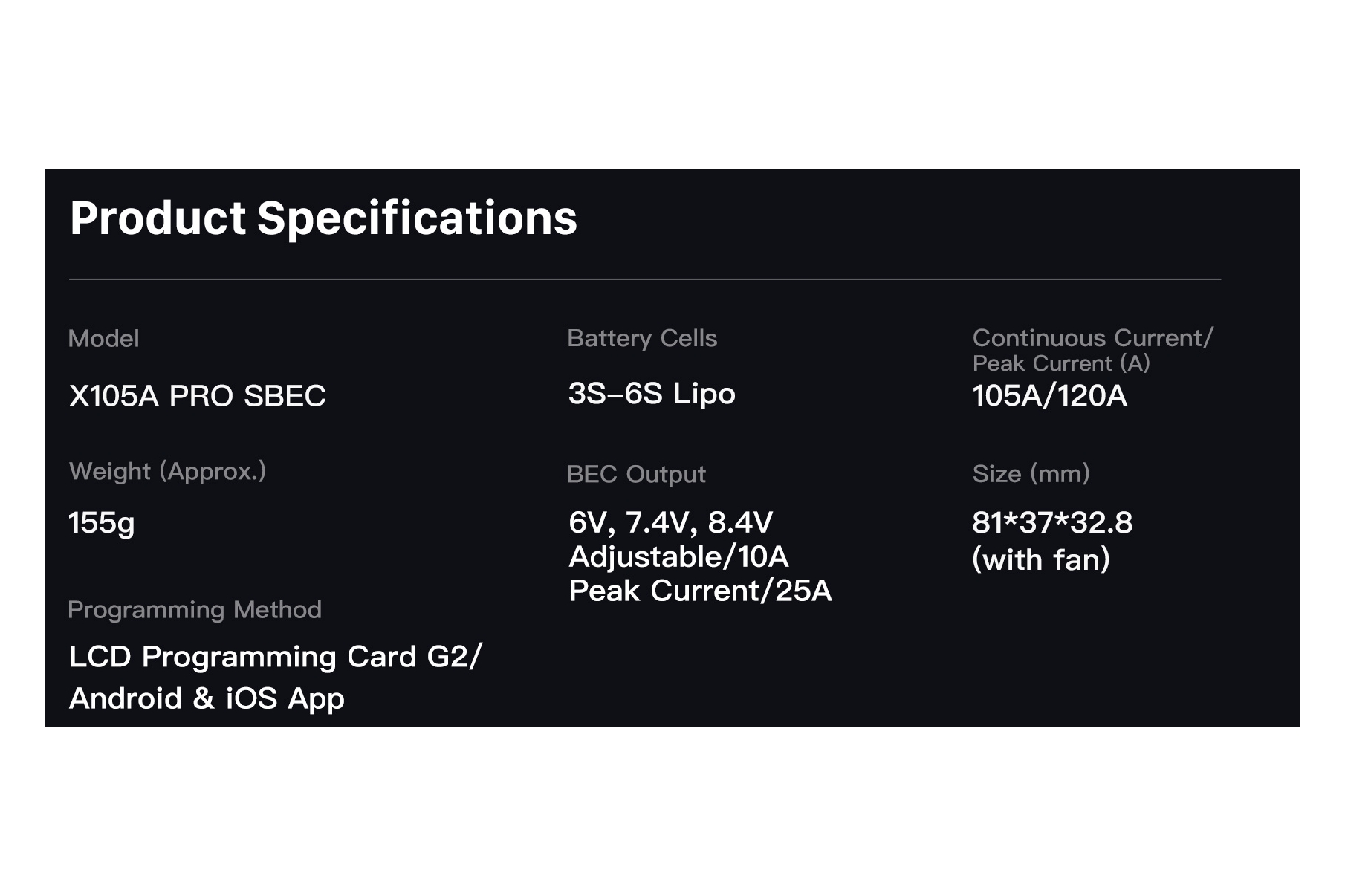 - Висока продуктивність: робочий струм 105A та піковий струм 120A забезпечують відмінну потужність для ваших моделей.
