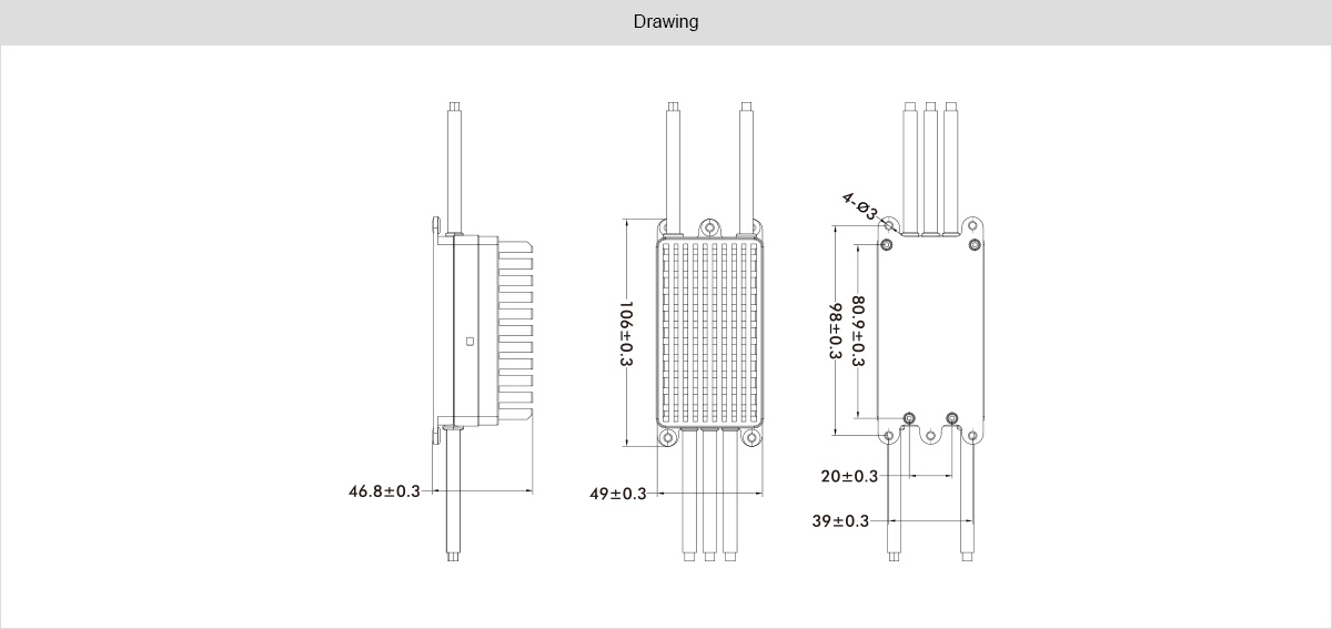 - Широкий діапазон напруги: підтримка 6-14s LiPo (22,2-51,8 Вольта) дозволяє використовувати регулятор з різними акумуляторами.