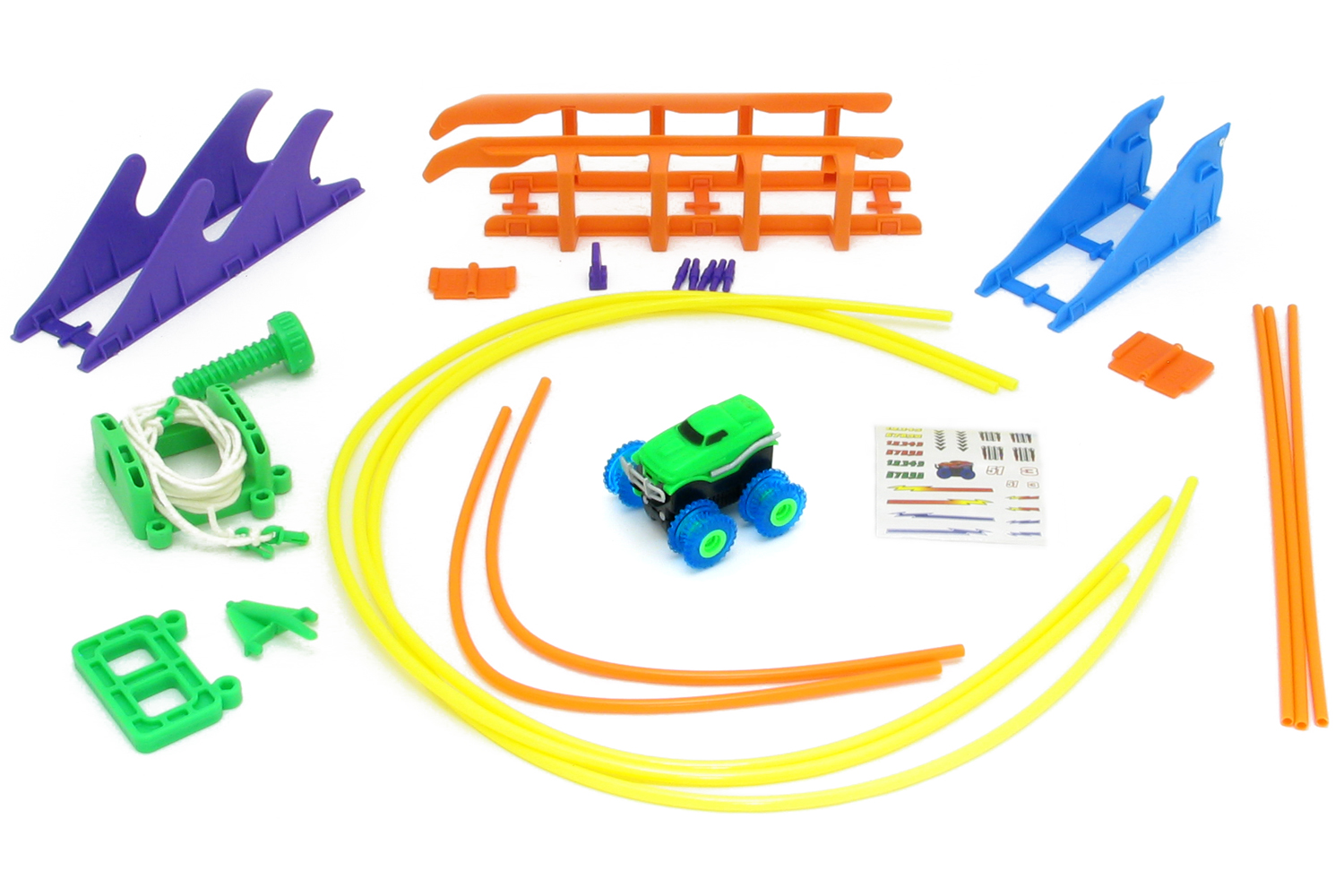 | Комплектація | Машинка — 1 шт.; Канатна дорога — 1 к-кт (опціонально); Волна - 1 к-кт; Трамплін — 1 к-кт; Міст — 1 к-кт; Прямі напрямні — 3 шт.; Гнучкі напрямні — 5 шт.; З'єднувальні елементи — 1 пак; Наклейки — 1 шт. |