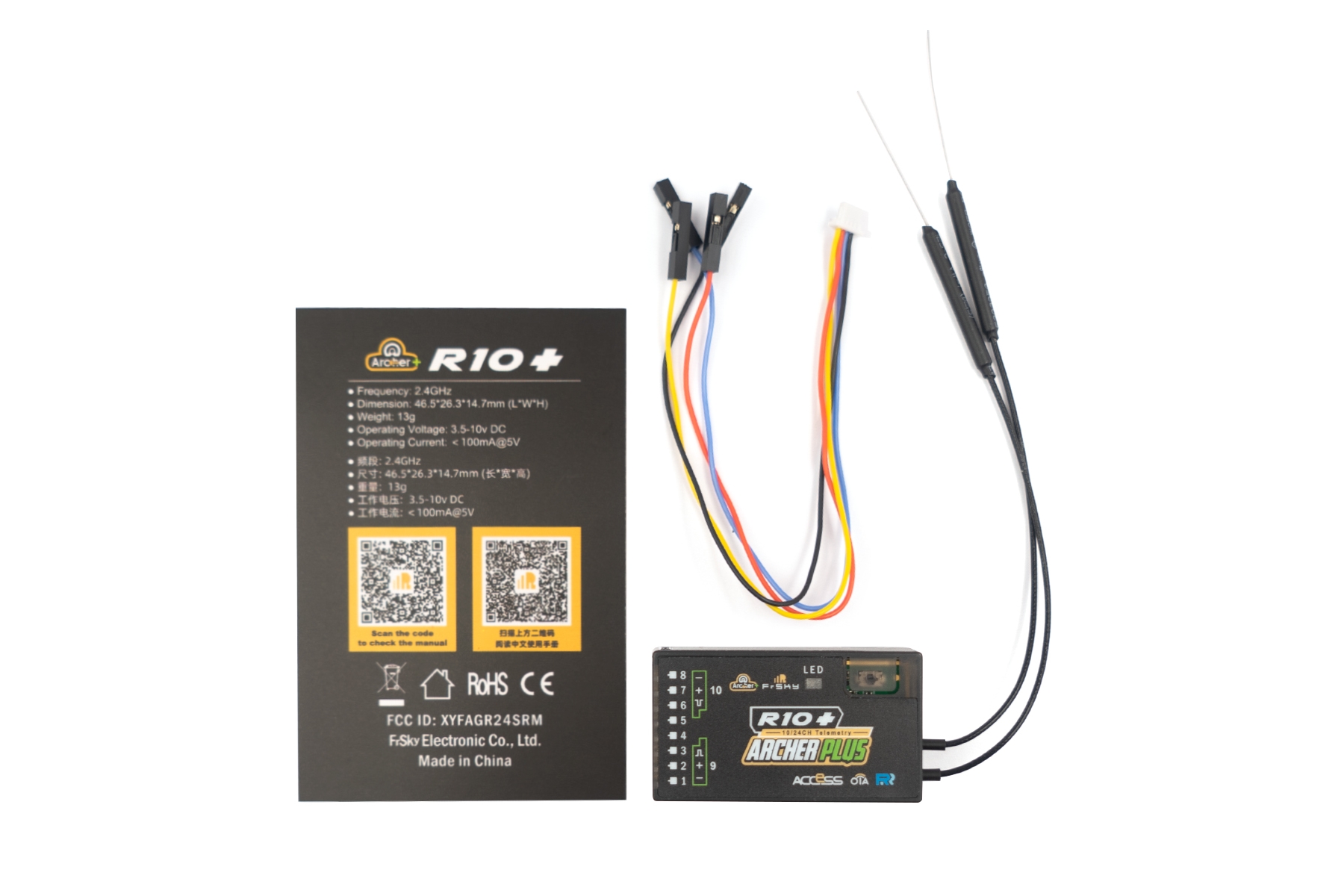 Приймач FrSky Archer Plus R10 призначений для використання з дронами та радіокерованими моделями, забезпечуючи стабільний та надійний зв'язок на частоті 2450 МГц. Його розміри (46,5*26,3*14,7 мм) та вага всього 13 г роблять його ідеальним рішенням для легких та компактних моделей.