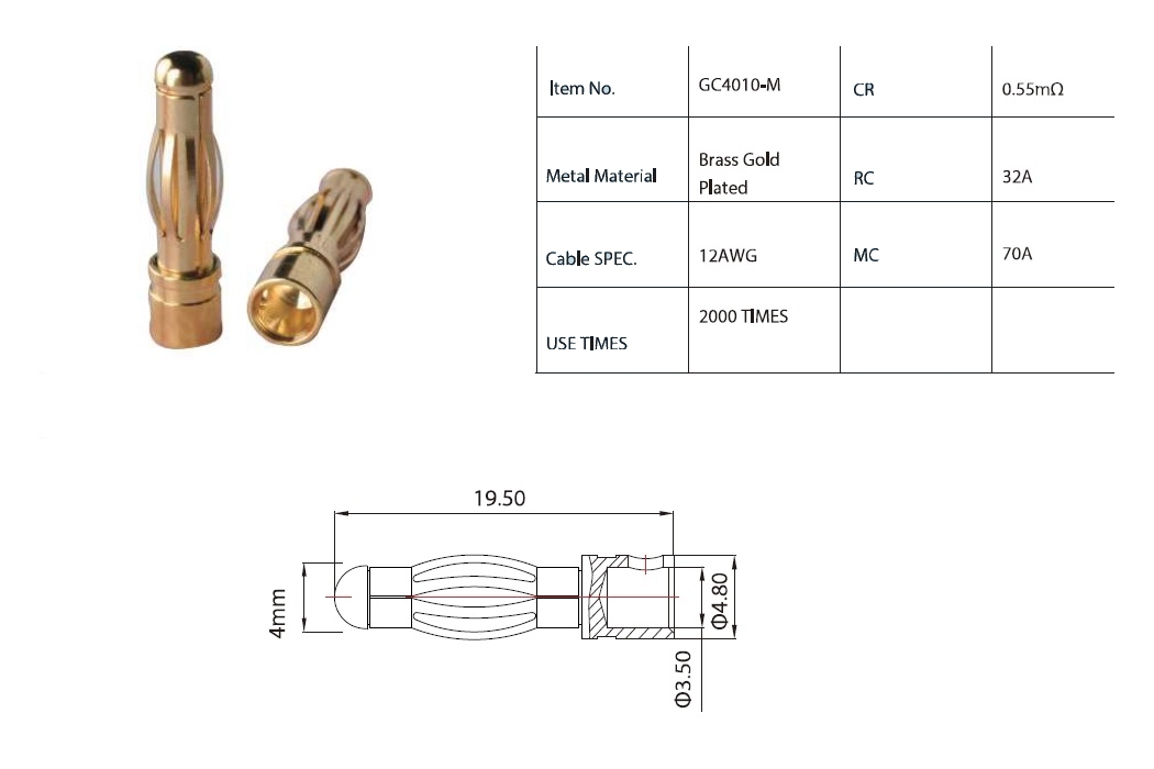TS Конектори AMASS GC4010 PLUG 4.0MM Extra Line Male 50 шт для радіокерованих моделей електричні роз'єми для під SHT55_Q
